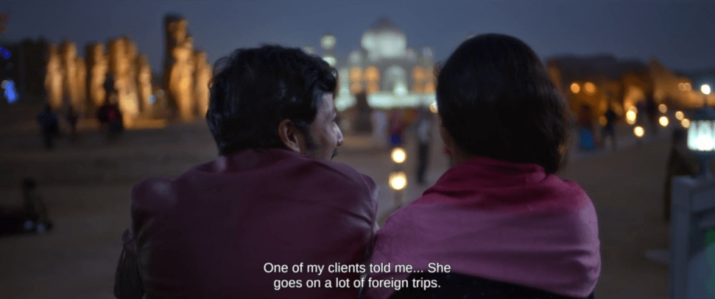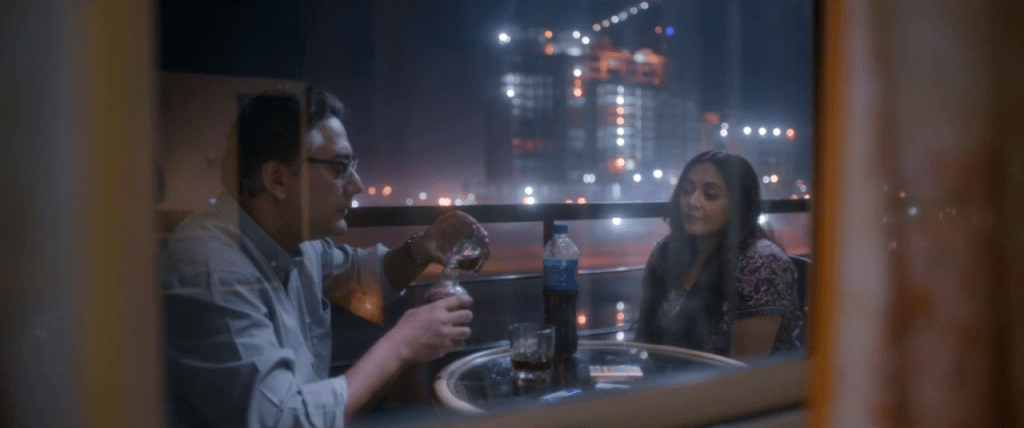 ছবিটির বিভিন্ন পর্যায়ে ফোকাসের ব্যবহারকে মন দিয়ে লক্ষ করলে একটা পুনরাবৃত্ত প্যাটার্ন খুঁজে পাওয়া যাবে। যে দৃশ্যে রাজা আর পিঙ্কি বসে বিদেশভ্রমণের স্বপ্ন দেখছে- সে জায়গায় ডিফোকাসে নির্মীয়মাণ পুজোমণ্ডপ (সম্ভবত) দেখতে পাওয়া যায়। ইস্টার আইল্যাণ্ডের মূর্তির আদলে তৈরি করা কতকগুলো মূর্তি, তাজমহলের রেপ্লিকা এবং সেইসব স্থাপত্য সংলগ্ন সমস্ত ঝলমলে আলোকে ক্যামেরা শ্যালো ফোকাসে আবছা করে দেয়। (ছবি ১)। এলা এবং ভাস্করদা নৌকায় চড়ে নদীতে ঘুরে বেড়াচ্ছে, পুরোনো দিনের স্মৃতি রোমন্থন করছেন; সেই সময় আবারও পেছনের ঘাটগুলির ঝলমলে আলোকে ক্যামেরা ব্লার করে দেয় (ছবি ২)। এই দু’জনই যখন নতুন ফ্ল্যাটের ব্যালকনিতে বসে পানীয় সহযোগে নতুন বাড়ি কেনার উদযাপন করছেন, তখনও দূরে বহুতলের আলোগুলি জোনাকির মতো লেগে আছে পর্দার গায়ে; ডিফোকাসে, আবছায়া হয়ে (ছবি ৩)। এই আলো ঝলমলে কলকাতা, লাইমলাইটের মাঝামাঝি থাকা মায়ানগরীর সঙ্গে এই মানুষগুলির স্মৃতি, স্বপ্ন, কামনা-বাসনার কোনও সরাসরি সংযোগ নেই। তাই বারংবার আদিত্যবিক্রম ফোকাসের ব্যবহারে ‘বিক্রয়যোগ্য কলকাতা’-কে তাঁর চরিত্রদের, ন্যারেটিভের থেকে এভাবে বিচ্ছিন্ন করে দিয়েছেন। কলকাতার যে অংশের স্রোতে মানুষ সামিল হতে চায়, যে অংশের যাপনের শরিক হতে চায়- সেই অংশকে পরিচালক রেখেছেন আবছা। আর যে সমস্ত মানুষগুলোর গল্প ছবিটির উপজীব্য, তারা দর্শকের সবথেকে কাছাকাছি অবস্থান করছে। কলকাতার এরকম একমাত্রিক প্রদর্শনের বিরক্তিকর চর্বিতচর্বণের যুগে ওয়ান্স আপন এ টাইম ইন ক্যালকাটা-র ফোকাসের এই ব্যবহার আমার কাছে চূড়ান্ত রাজনৈতিক একটি সিদ্ধান্ত।