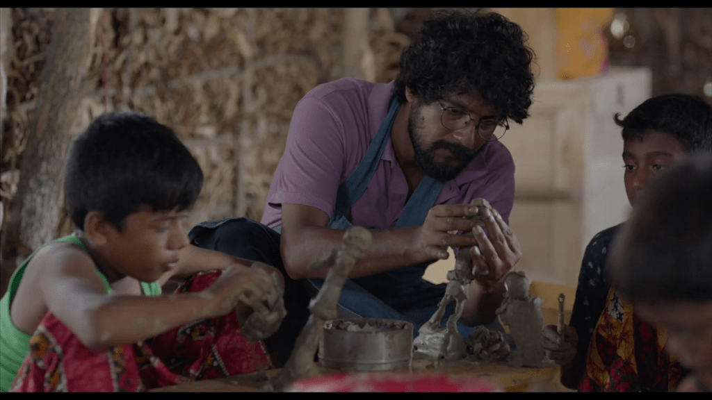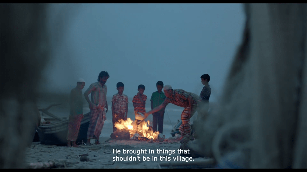 কয়েকটি উদাহরণ দিলে বিষয়টি স্পষ্ট হবে। ছবির শুরুতেই বোঝা যায়, রুদ্রর কাজ নিয়ে গ্রামের মানুষদের মধ্যে চাপা একটি অসন্তোষ তৈরি হচ্ছে। যেহেতু সে ভাস্কর, ভাস্কর্য তৈরি করে; গ্রামের ধর্মপ্রাণ মুসলমান জেলেদের কাছে তা কেবলই মূর্তি মাত্র, যা কিনা ইসলাম ধর্মের বিরোধী। অতএব রুদ্র গ্রামে যাওয়ার পরেই প্রকৃতির খেয়ালে যে ইলিশ মাছ আসা বন্ধ হয়ে যায়, তার সরাসরি দায় পড়ে তার উপরেই – শহর থেকে সে যেন অভিশাপ নিয়ে এসেছে, গ্রামের পবিত্র মাটিতে মূর্তি বানিয়ে সে অভিশাপ সবার প্রতি চারিয়ে দিচ্ছে। এহেন অন্ধবিশ্বাসের জায়গাটি ছবিতে খুব স্পষ্ট ভাবে নির্মিত হয় – গ্রামের চেয়ারম্যান সবাইকে তাতিয়ে দেন, তার বিরুদ্ধে জনরোষ তৈরি হয় – কিন্তু রুদ্র দুই-একবার বক্তৃতা করার চেষ্টার বাইরে বিশেষ কিছুই করতে পারে না। সন্দেহপ্রবণ গরীব এক জেলের মাধ্যমে তার ঘর যখন তছনছ হয়, তখনও গ্রামের সালিশি সভার বিচারের সামনে তার কিছুই করার থাকে না। সেই গরীব জেলের একমাত্র সম্বল একটি গরুকে কুরবানি করার রায় দেন চেয়ারম্যান, রক্তে ভেসে যাওয়া সমুদ্রতট থেকে রুদ্র চোখ ফিরিয়ে নেয়, নিষ্ক্রিয়তা ছাড়া যেখানে আর কিছু করার নেই।