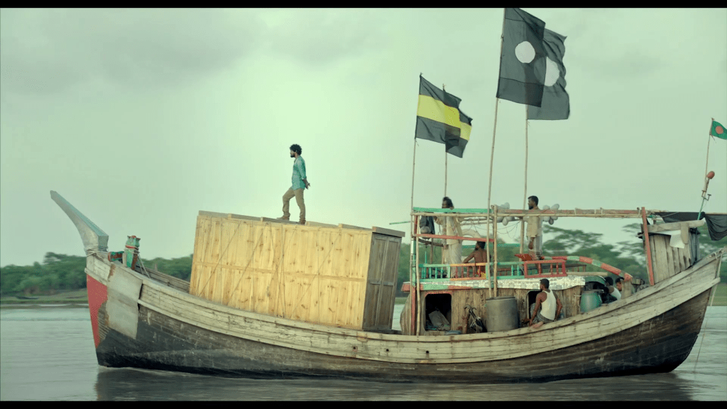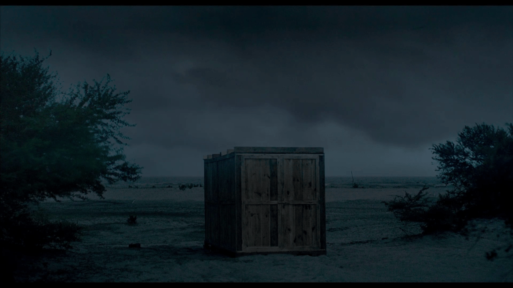 একইভাবে ধরা যাক ছবির শেষ শটটির কথা। দুর্যোগে আটকে থেকে রিলিফ সেন্টারে আল্লার নাম জপ করছেন গ্রামের সমস্ত মানুষ, এদিকে রুদ্র আর টুনি বদ্ধ হয়ে রয়েছে সেই বিরাট বাক্সের ভিতরে। এ লেখার শুরুতেই যা বলেছিলাম – ছবিটি এই অংশে হঠাৎ শেষ হয়ে যায় – এর পরে বন্যা তাদের ভাসিয়ে নিয়ে যাবে, নাকি অনাত্মীয় নারী-পুরুষের একসাথে রাত কাটানোর অপরাধে তাদের গণপিটুনিতেই মরতে হবে, তার আশঙ্কাটুকুই থেকে যায় দর্শকের মনে। বাক্সের মধ্যে আটকে থেকে অল্প কথাবার্তা, মাঝে মাঝে হাসি গল্প করতে করতে রুদ্র আর টুনি হঠাৎ কোনো অজানা শব্দ শুনতে পায় – তৎক্ষণাৎ কাট করে আমরা ছবির শেষ শটটিতে আসি। সেই ঘননীল রাত্রির ভয়াল সমুদ্রতট, দুইপাশে দুই গাছের মাঝে প্রায় সুররিয়াল চিত্রকলার মতো দাঁড়িয়ে রয়েছে অতিকায় সেই বাক্স। শোঁ শোঁ হাওয়া তার উপস্থিতি জানান দিচ্ছে গাছের চঞ্চল পাতায় এবং সাউন্ডট্র্যাকে – অন্যদিকে সমুদ্রের চাপা গর্জন ফুঁসছে বাক্সের ঠিক ঐ প্রান্তেই। এই শটে এসে যেন শুধুমাত্র আর প্রধান চরিত্রই নয় – সমস্ত ছবিটিই তার ঘটমান বাস্তবতার সামনে নতজানু হয়ে হার স্বীকার করে নেয়, বুঝতে পেরে যায় কোনোভাবেই সামনে এগিয়ে যাওয়া সম্ভব নয়, তার এবার শেষ হয়ে যাওয়া ছাড়া গতি নেই। আমরা অপেক্ষা করতে থাকি অবশ্যম্ভাবী ধ্বংসের – তাকে দর্শকের কল্পনার উপরেই ছেড়ে দেন পরিচালক।