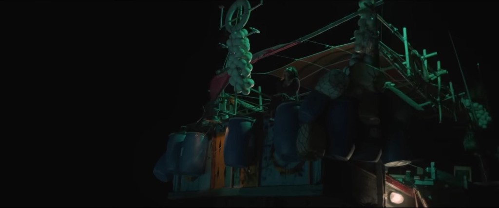 ১। বোটে আর গুলতি নেই, কিন্তু বোটের নীচে সমুদ্রের মধ্যে ভাসছে বোটে আটকে পড়া ছেঁড়া কাপড়ের টুকরো। তা ঠিক কিভাবে ওইখানে আটকে পড়লো তা সঠিকভাবে বোঝা না গেলেও এই দৃশ্য হাওয়ায় উড়তে থাকা গোলাপি শাড়ির মিজ-অন-সিন কে মনে করায়। ২। নৌকার উপরে জটিল অলৌকিক ঘটনাক্রম চলছে। ইতিমধ্যে, রাতেরবেলা ঠিক নৌকার নীচেই ঘুরতে দেখা যায় একটি বড়ো মাছকে। মাছটি আর কোথাও যায়না- নৌকাটিকে আবর্তন করে তার চারিপাশেই ঘুরতে থাকে। এই মাছই যেন নৌকার ঘটনাক্রমকে নিয়ন্ত্রণ করে চলেছে। সাউন্ডে শোনা যায় সেই আনক্যানি মিউজিক। এই দৃশ্য ও শব্দ নির্মাণ দর্শককে মনে করিয়ে দেয় রূপকথার গুলতির কথা- যে মাছ হয়েই সমুদ্র থেকে উঠে এসেছিলো।